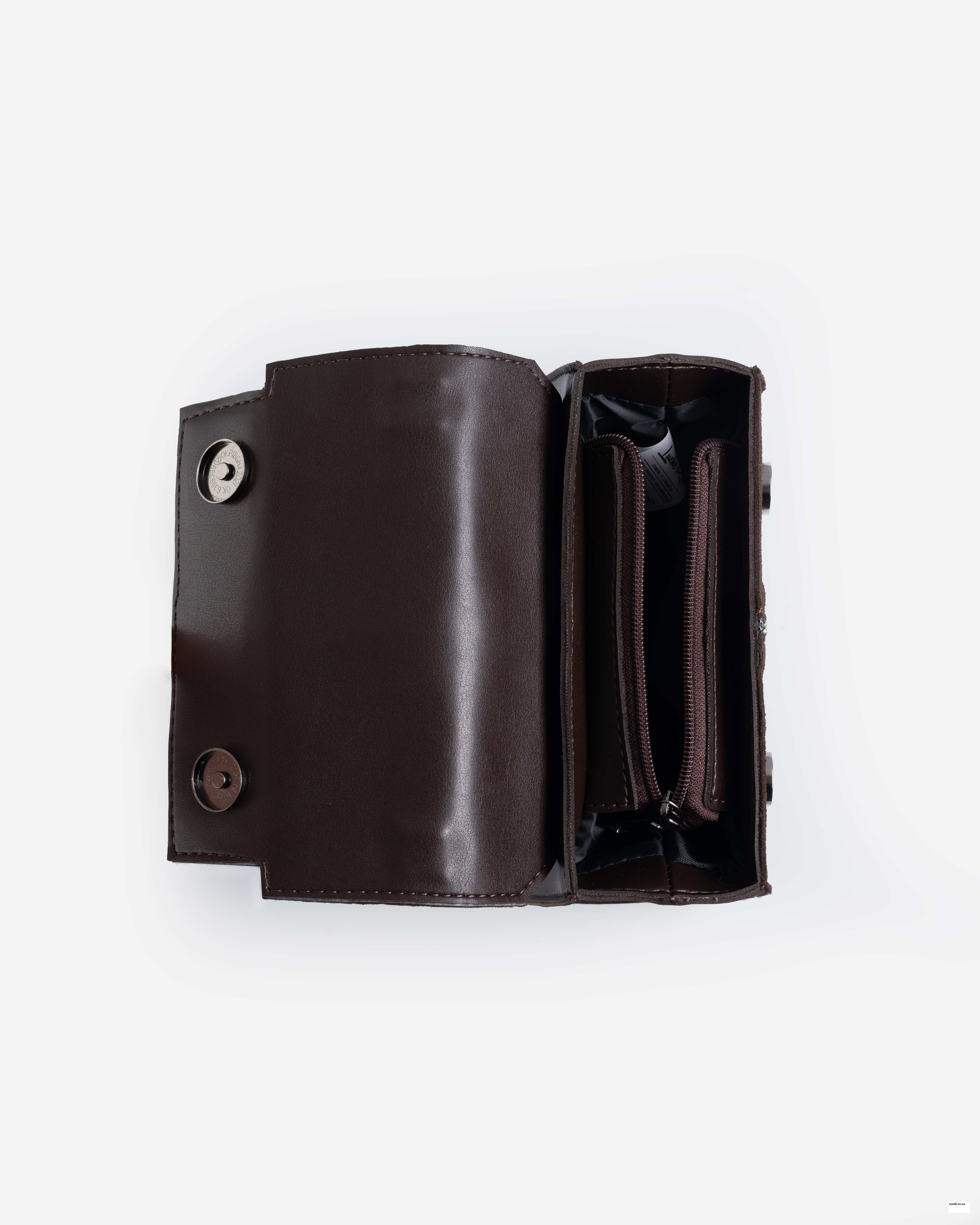 Невелика жіноча сумочка виготовлена з високоякісного шкірзамінника та якісної надійної фурнітури в кольорі - нікель. Одне відділення зручно розмістить великий гаманець, мобільний телефон та необхідні дрібниці. Всередині також розташована одна кишеня на застібці.
